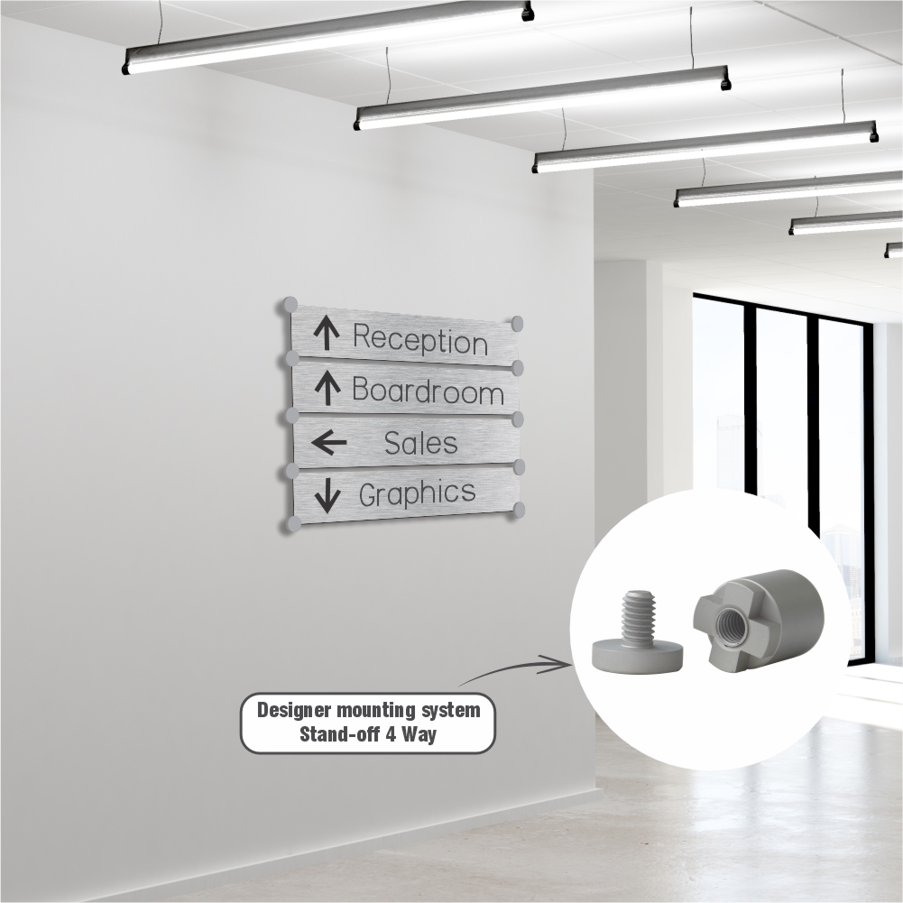 This innovative 4-way standoff allows for creative display options for signage, photographs, or other flat objects. Can be used with Glass, Aluminium Composite Panels, and Acrylic. Each Standoff can accommodate four pieces of chosen material. Aluminium with a satin finish and accommodates panels (5-12mm). Sign Material excluded.