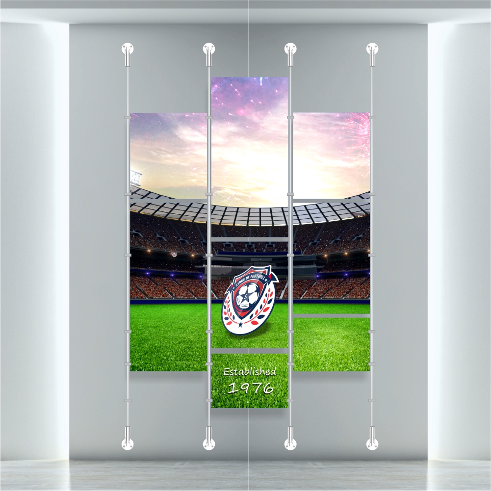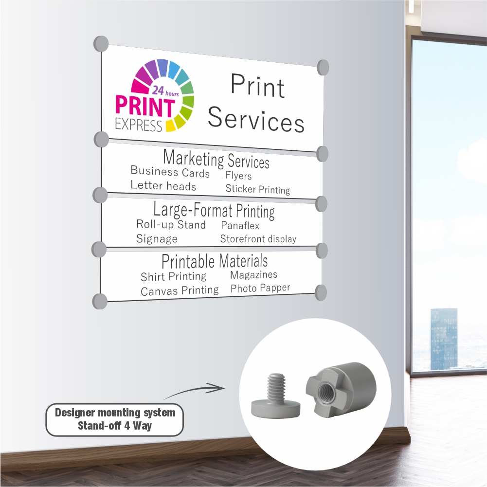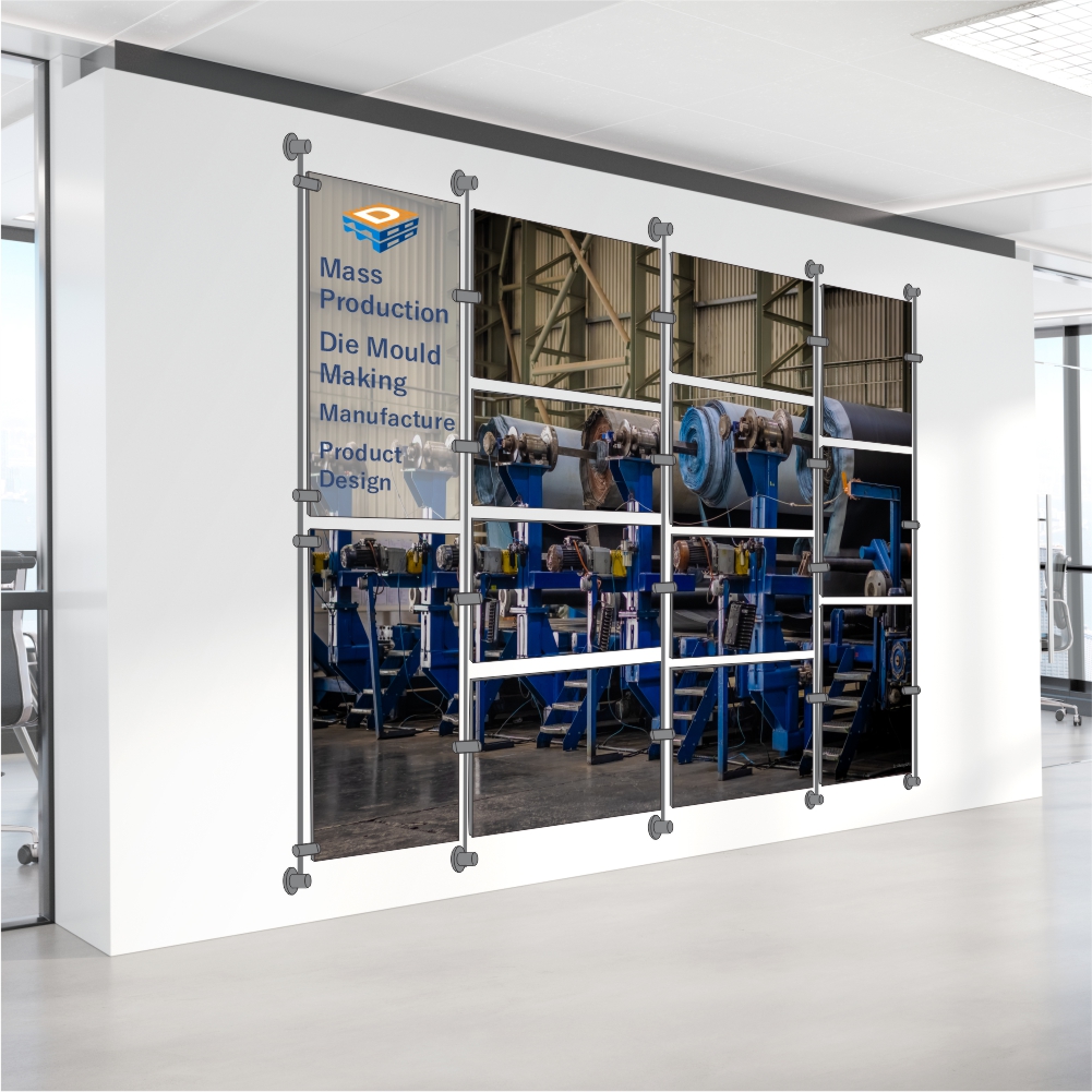 Showcase your artwork, signage, and more with a touch of modern elegance. Choose from our wide range of designer mounting systems available to you, from ceiling hanging systems, floor to ceiling systems, wall clamps, aluminium standoff 4-way systems, aluminium wall fixtures, chrome standoff edge grip systems, and aluminium free standing frame Kit.