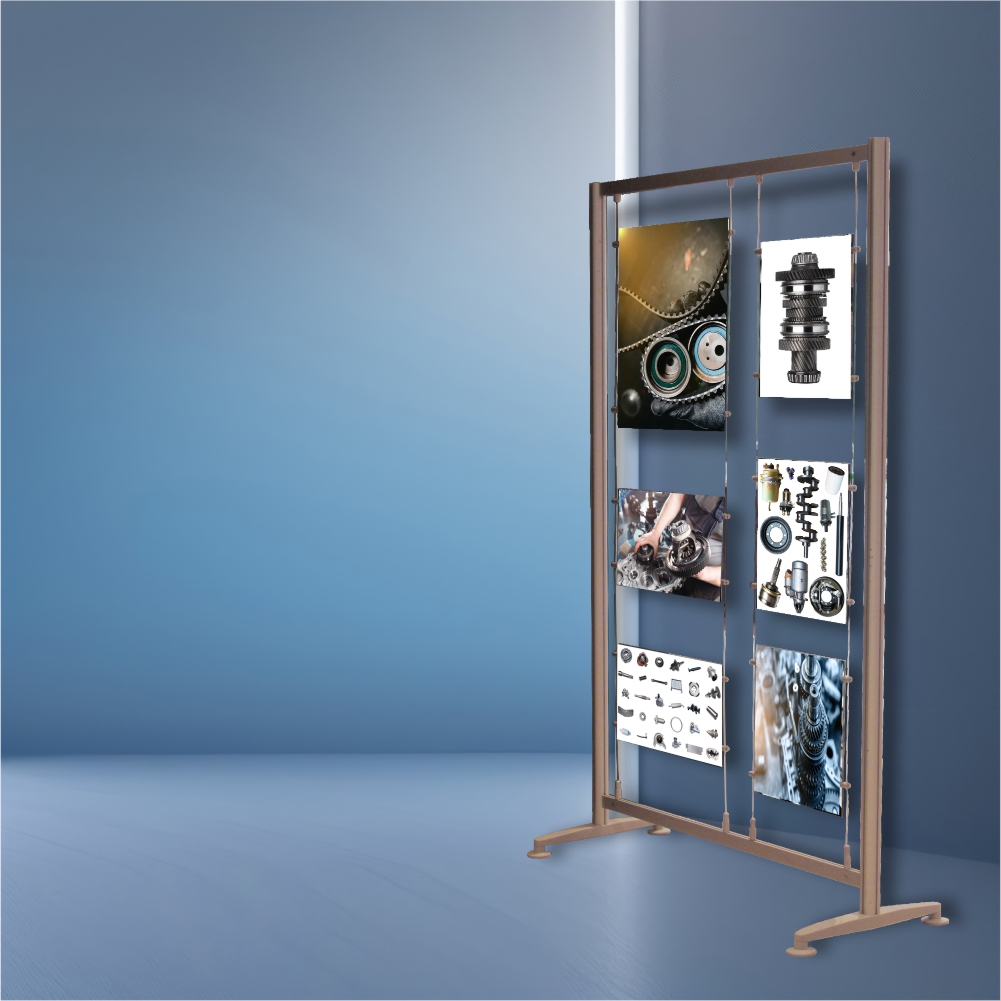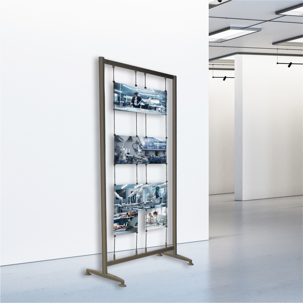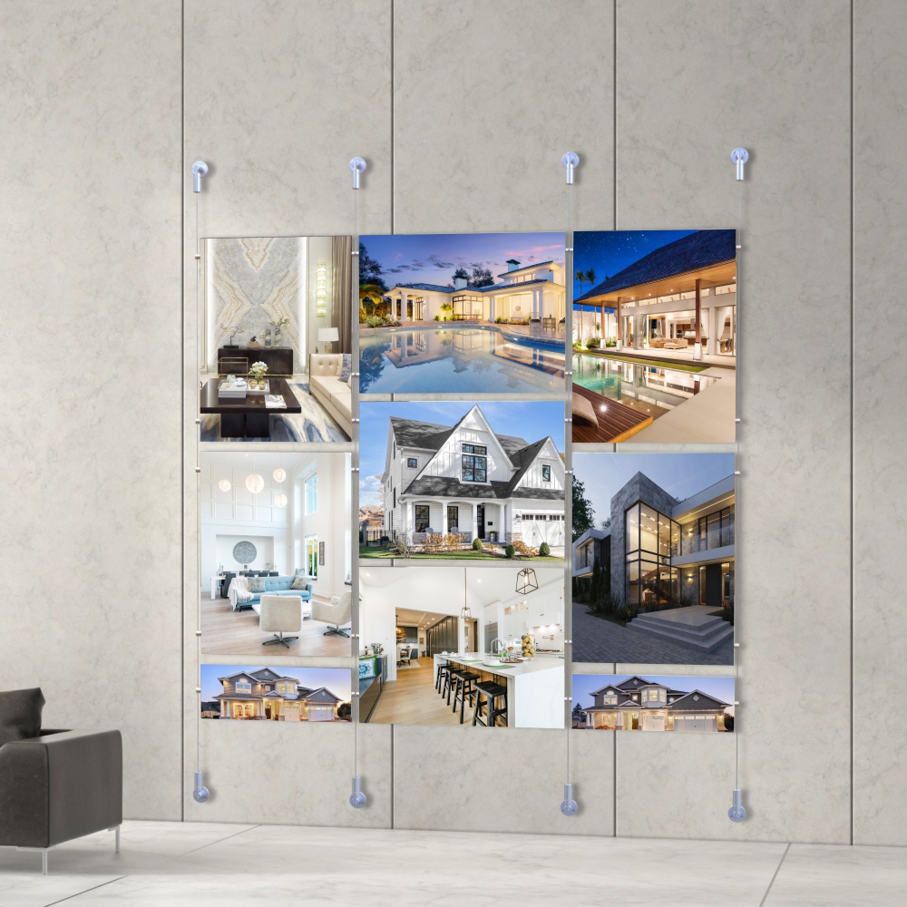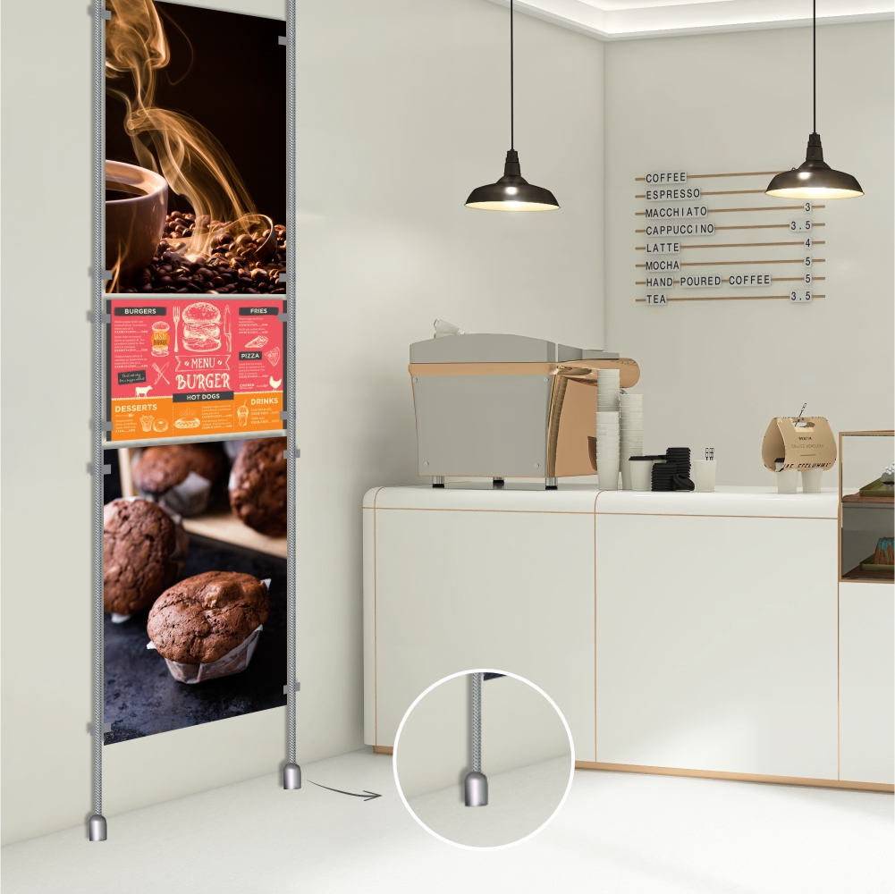 Showcase your artwork, signage, and more with a touch of modern elegance. Choose from our wide range of designer mounting systems available to you, from ceiling hanging systems, floor to ceiling systems, wall clamps, aluminium standoff 4-way systems, aluminium wall fixtures, chrome standoff edge grip systems, and aluminium free standing frame Kit.
