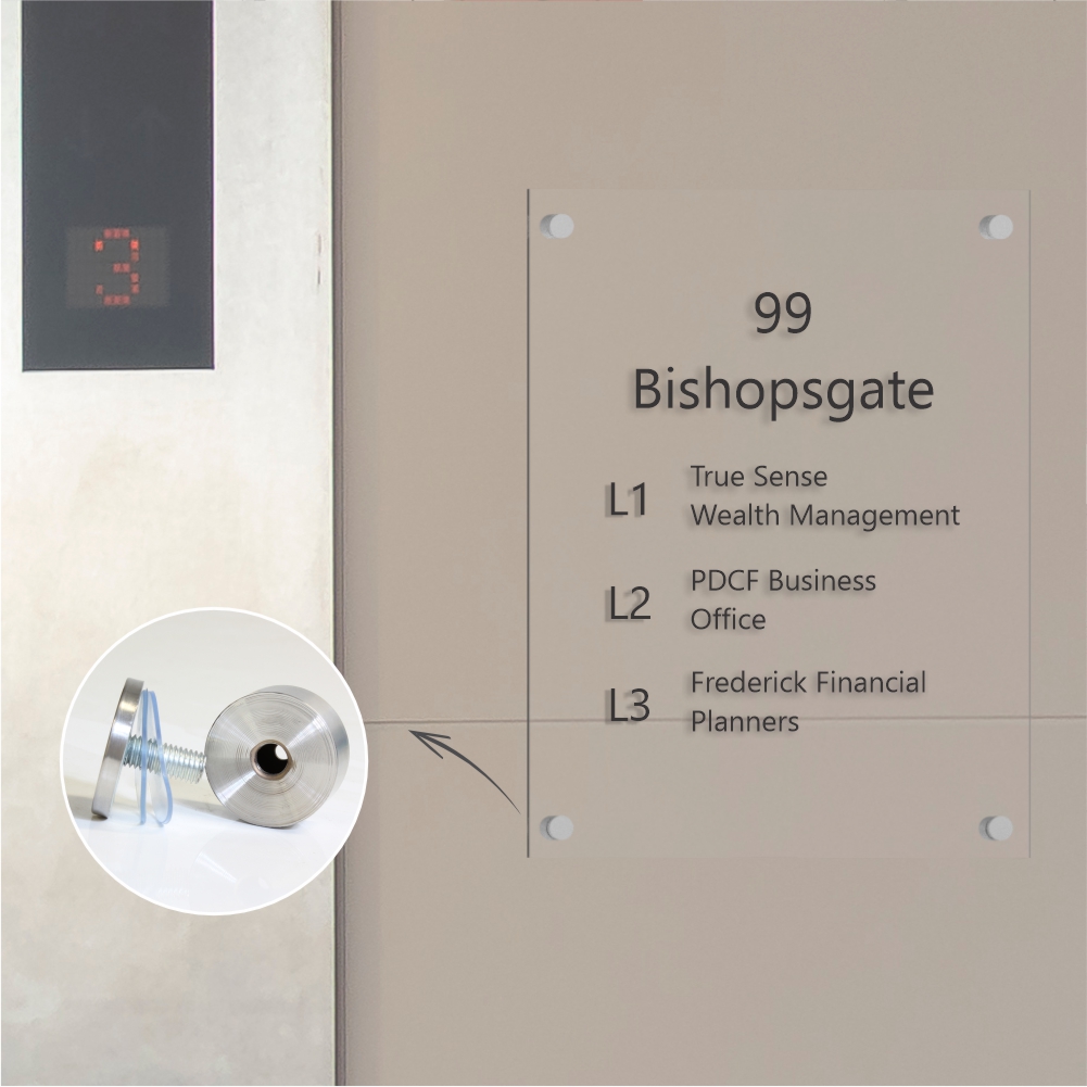Our Stand-off Single Grip mounting system is perfect for holding signs, panels, or acrylic displays away from the wall. Used to secure Glass, Aluminium composite panels or Acrylic against a wall surface. Aluminium with a satin finish and accommodates panels 3-6mm. Sign material excluded.
