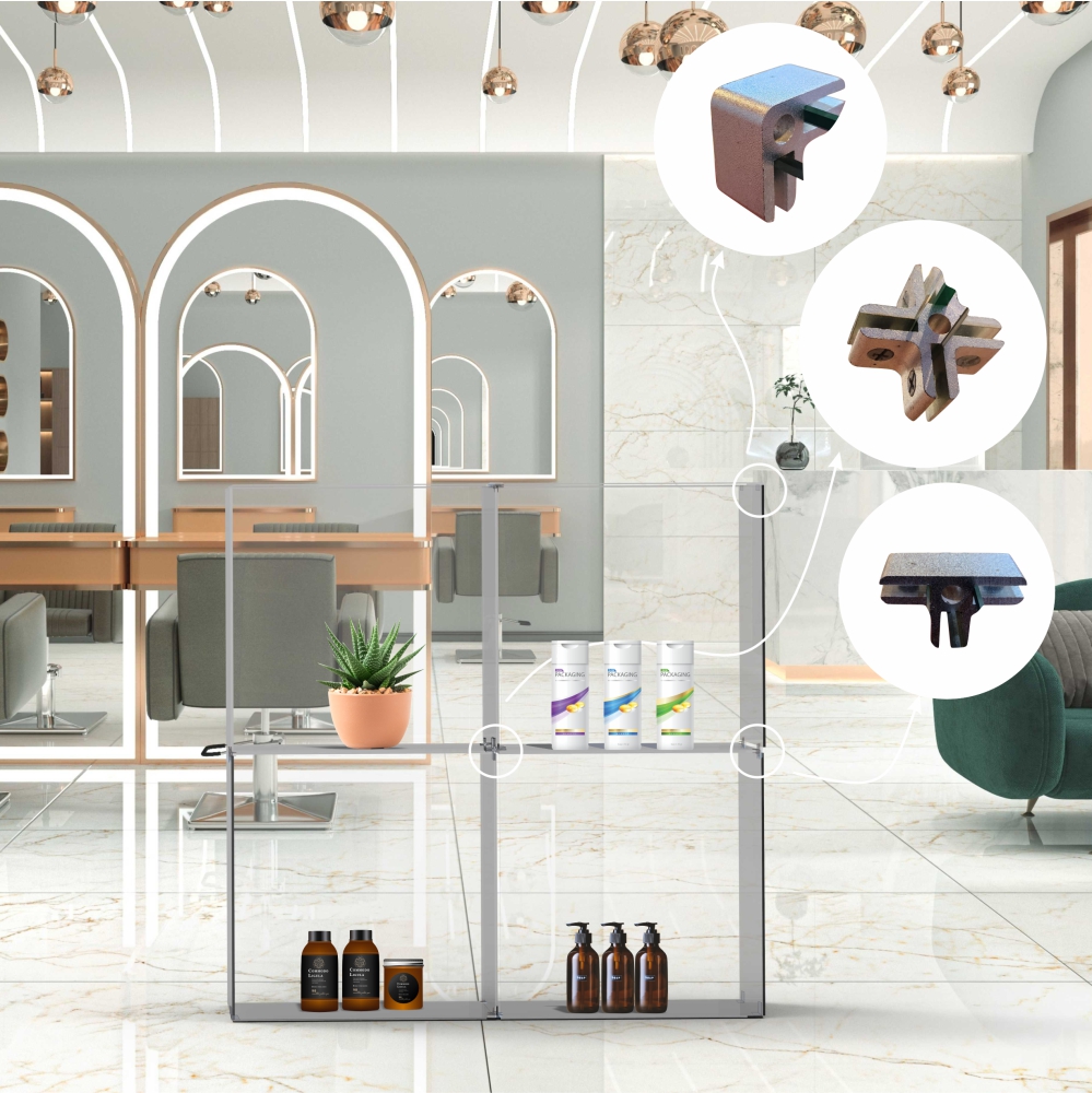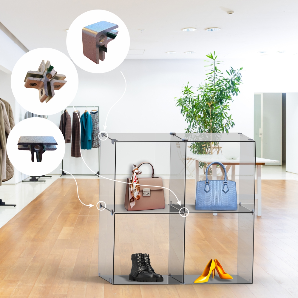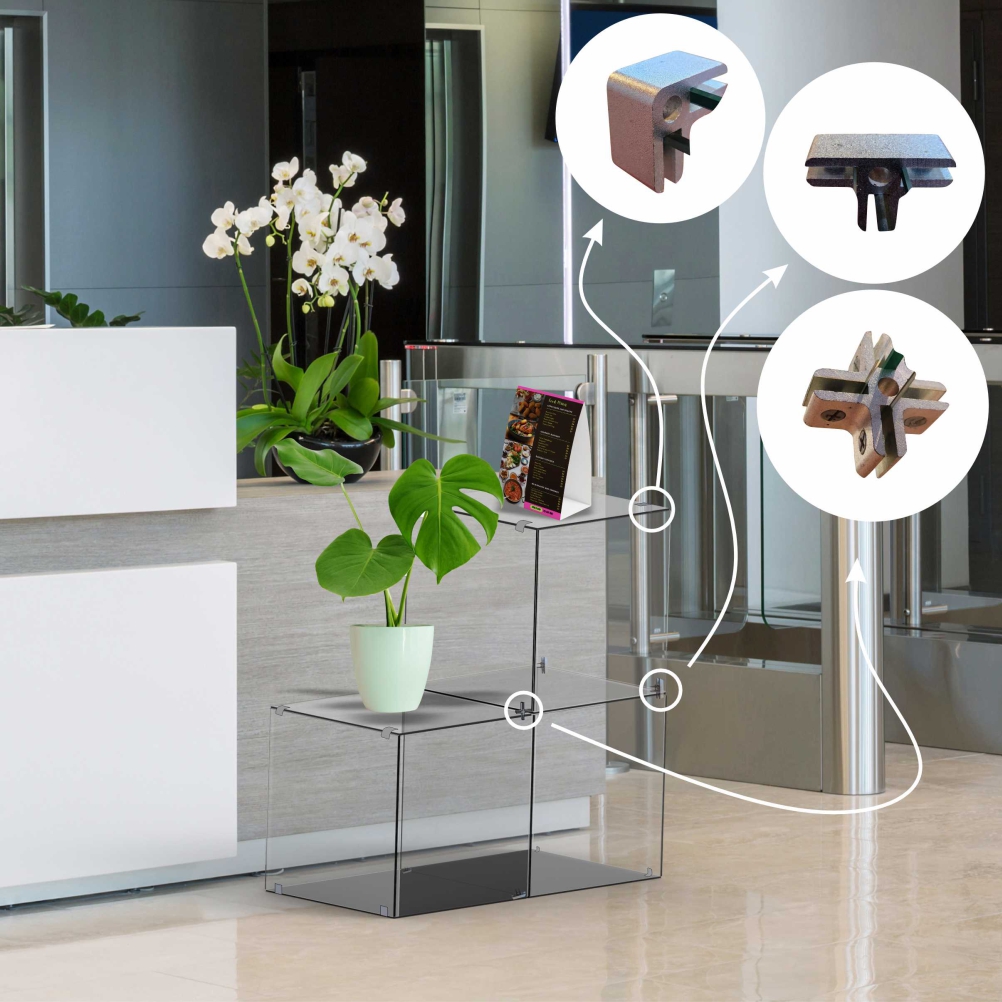 The Four Way Glass Cube Grip allows you to connect glass panels on each side within the center of a glass display stand. Aluminium with satin finish. Accomodates panels 6 - 8 mm. Multiple design layouts. Can be used with glass, aluminium composite panel, acrylic etc.