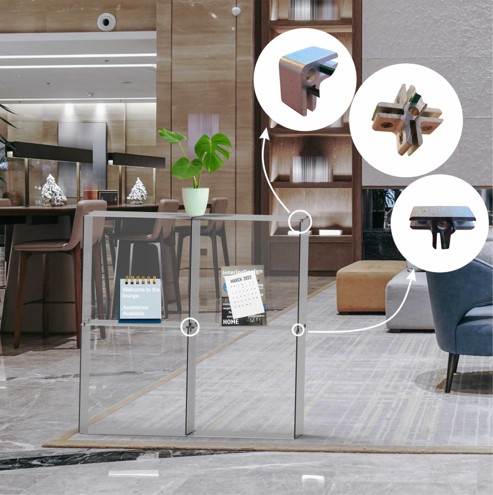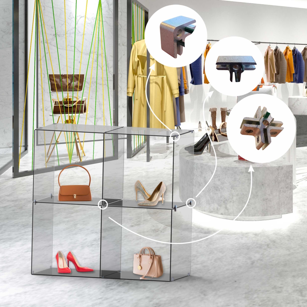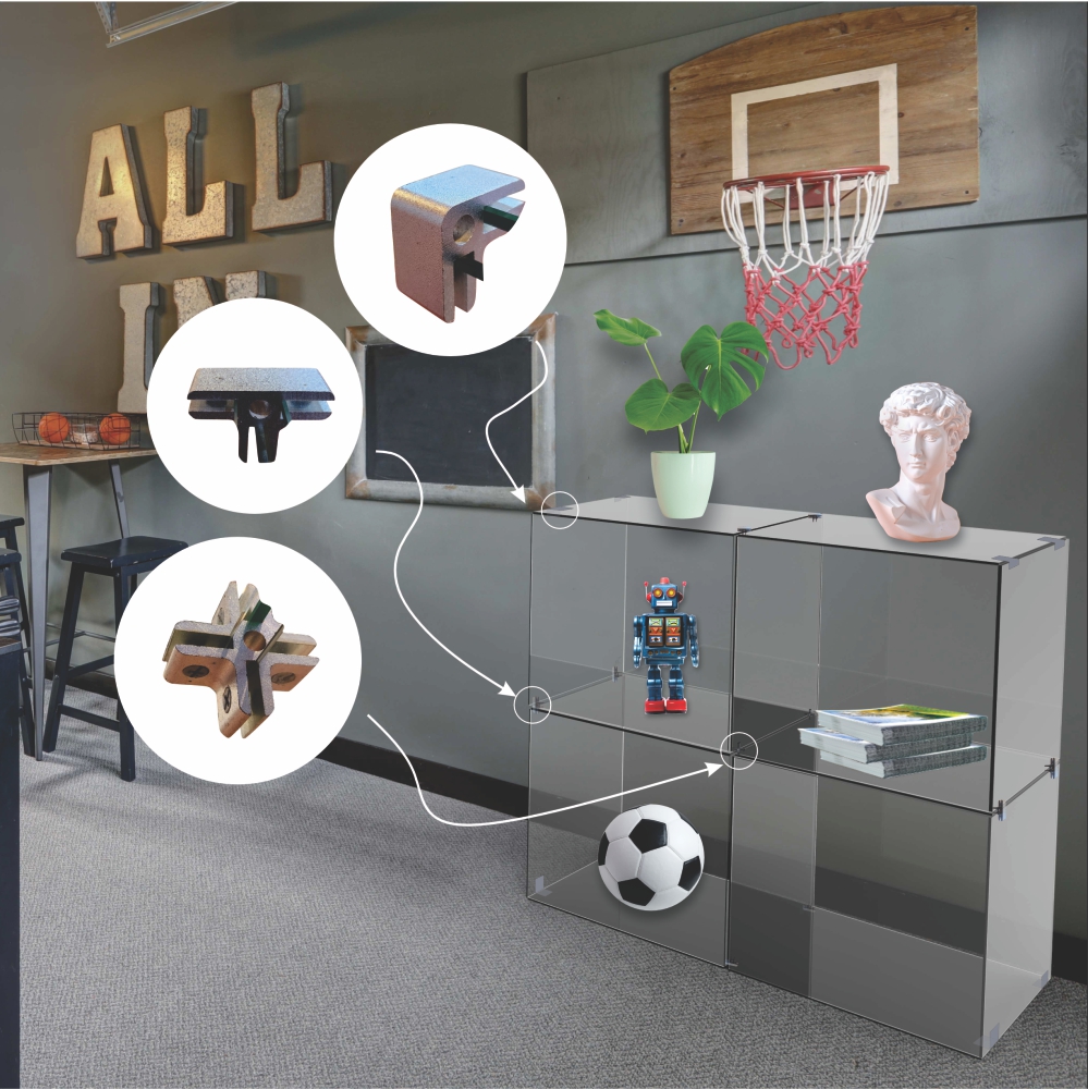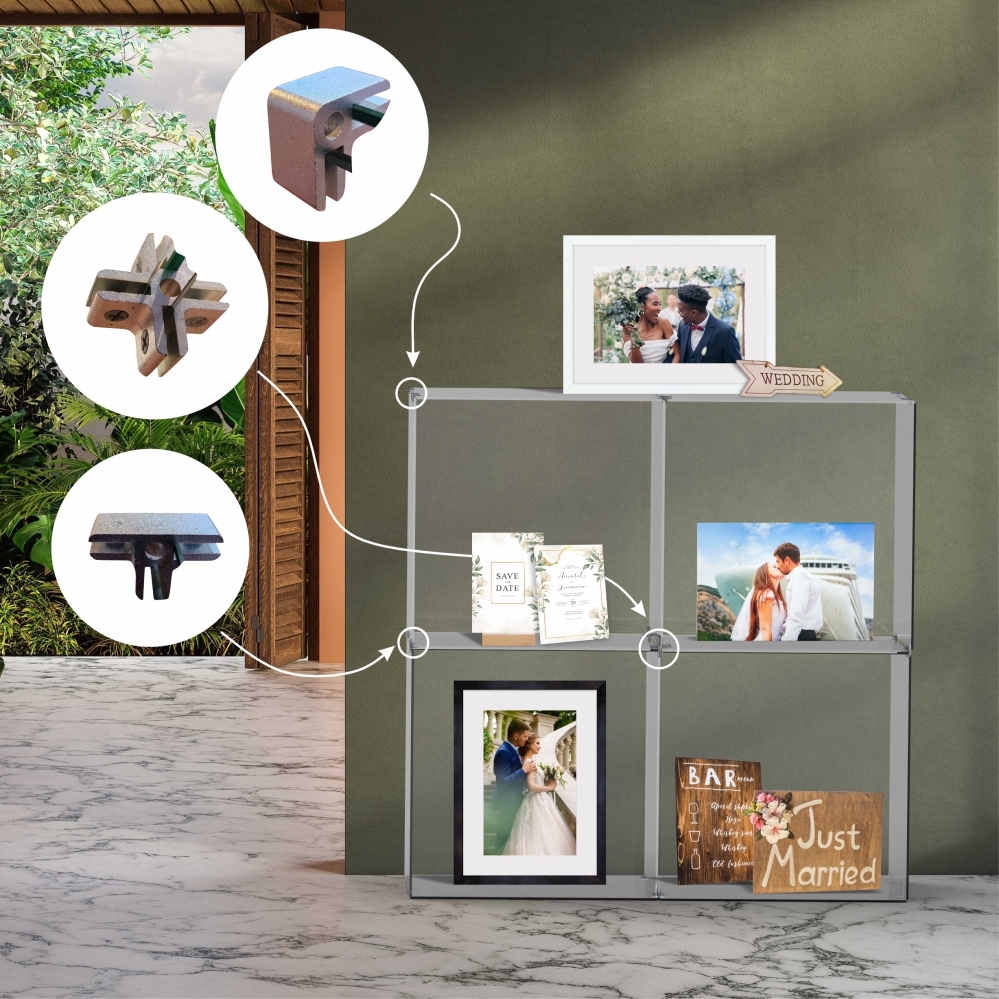 The Four Way Glass Cube Grip allows you to connect glass panels on each side within the center of a glass display stand. Aluminium with satin finish. Accomodates panels 6 - 8 mm. Multiple design layouts. Can be used with glass, aluminium composite panel, acrylic etc.