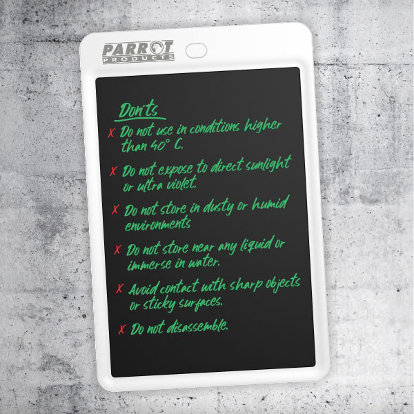 We recommend using Parrot Products markers, erasers to write and clean your writing slate.